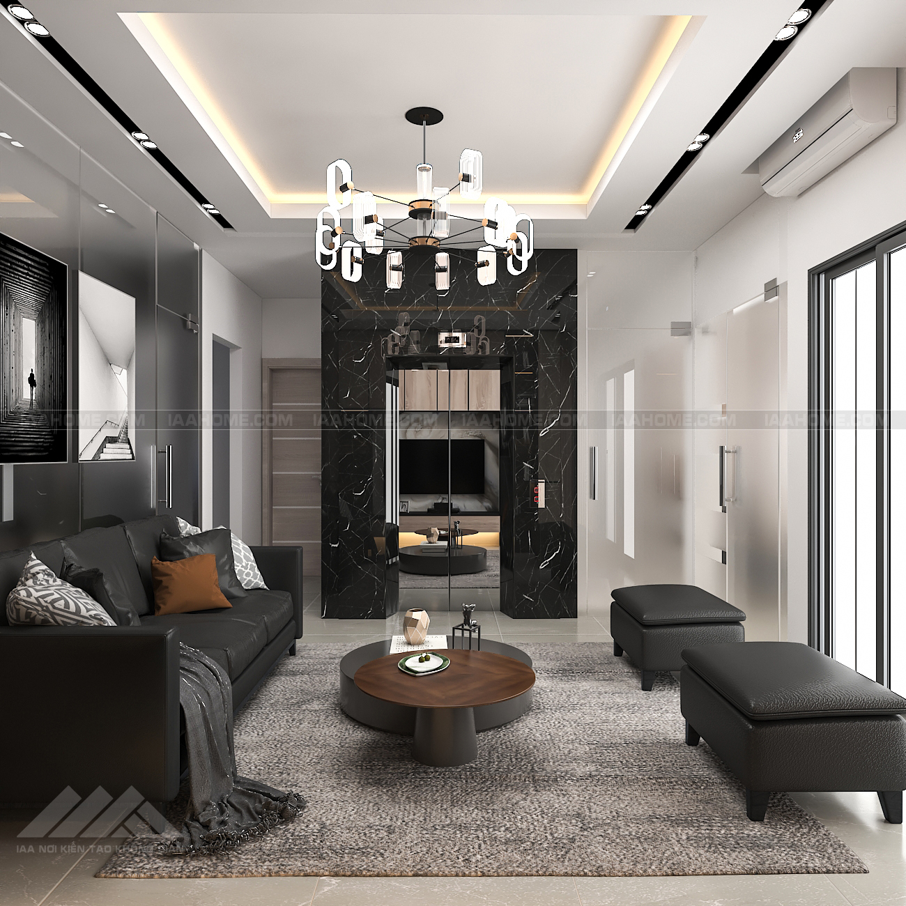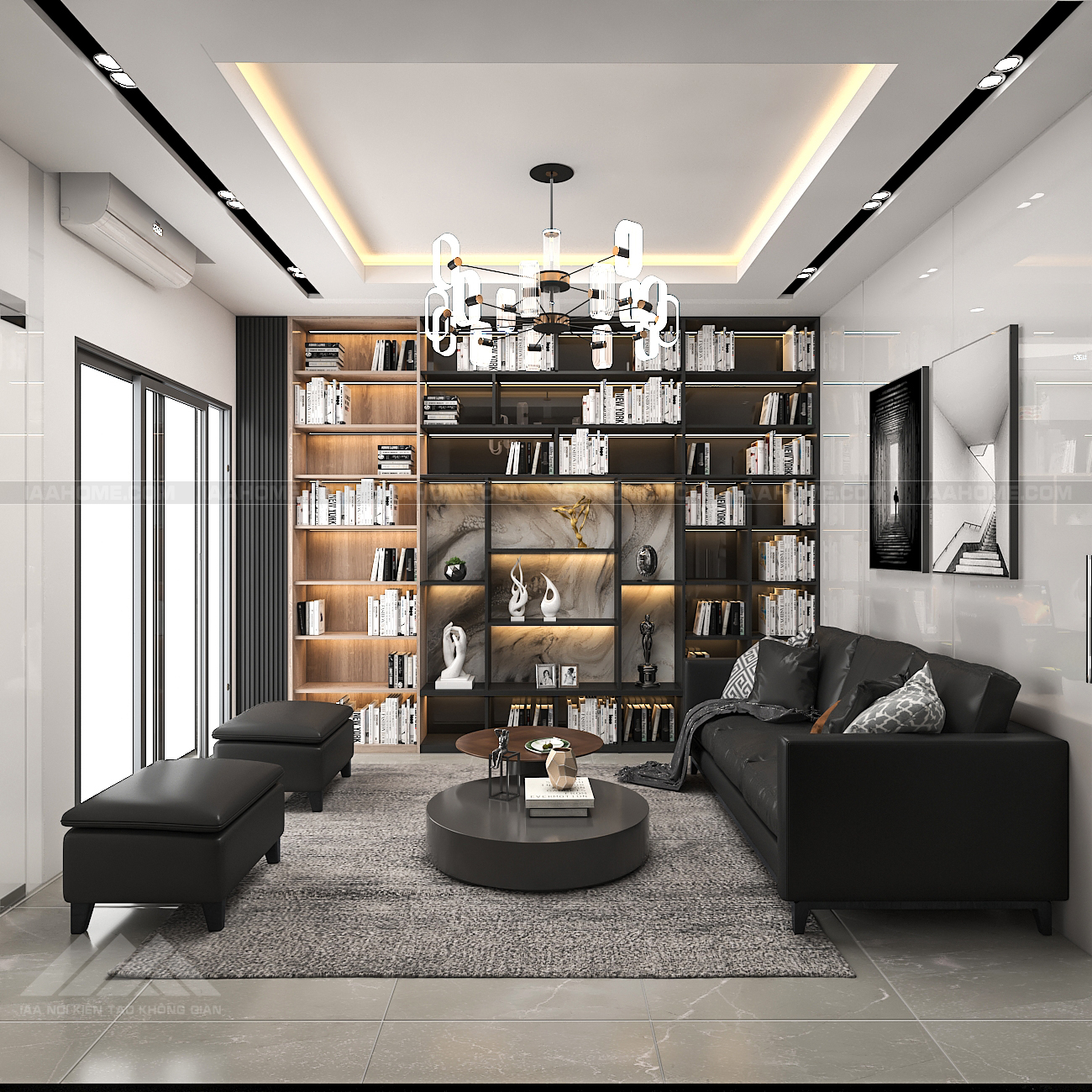 – Phòng tiếp khách là không gian đầu tiên khi khách tiếp cận với công ty , gia chủ muốn có 1 không gian ấn tượng . IAA đã thiết kế trên bức tường đối diện với cửa thang máy là 1 bức tường sách lớn với mong muốn để rất nhiều sách ở đây để lan tỏa chi thức đến mọi người và tông màu chủ đạo của không gian là màu ghi đen và màu gỗ sáng . nó làm toát lên cá tính riêng cho không gian của chủ đầu tư.