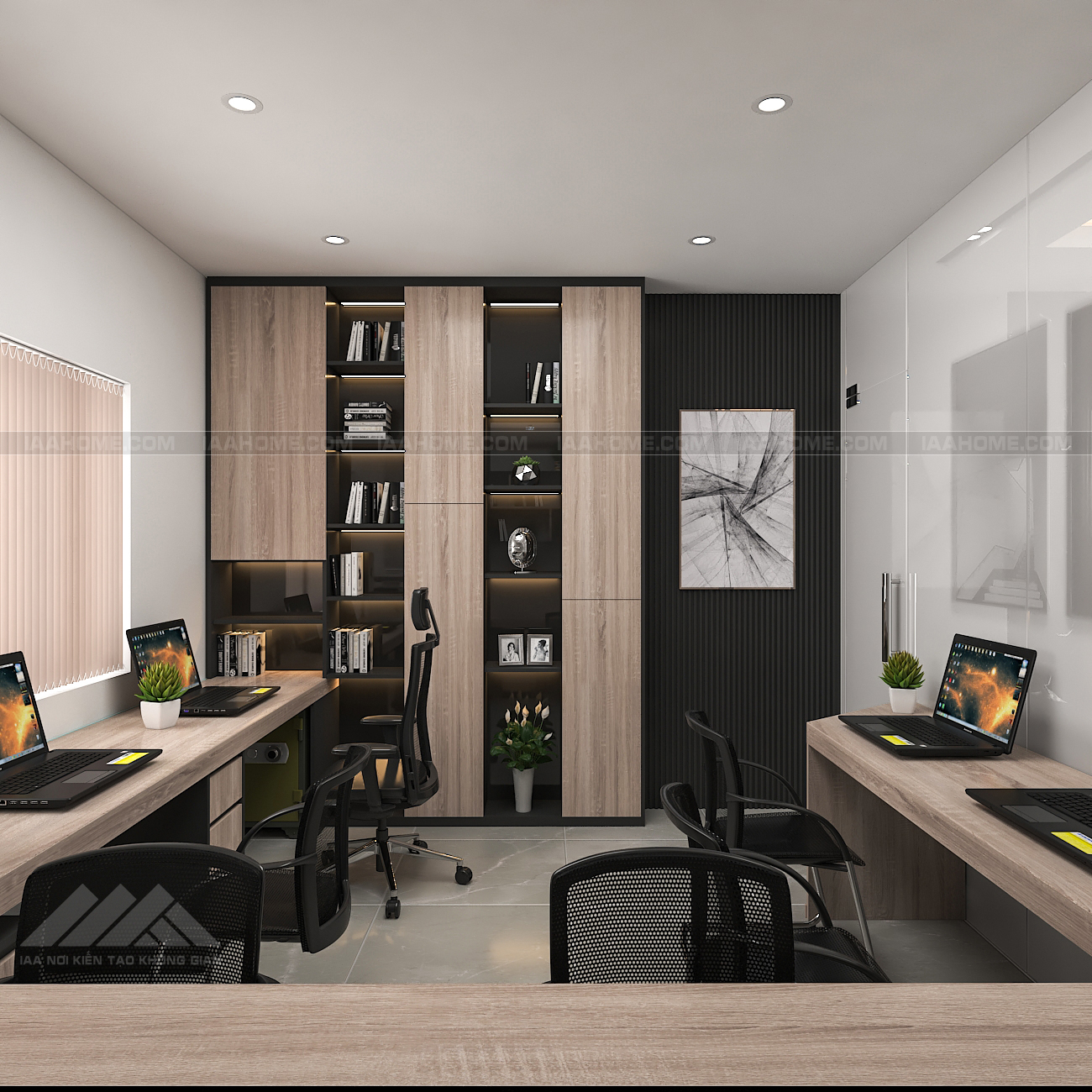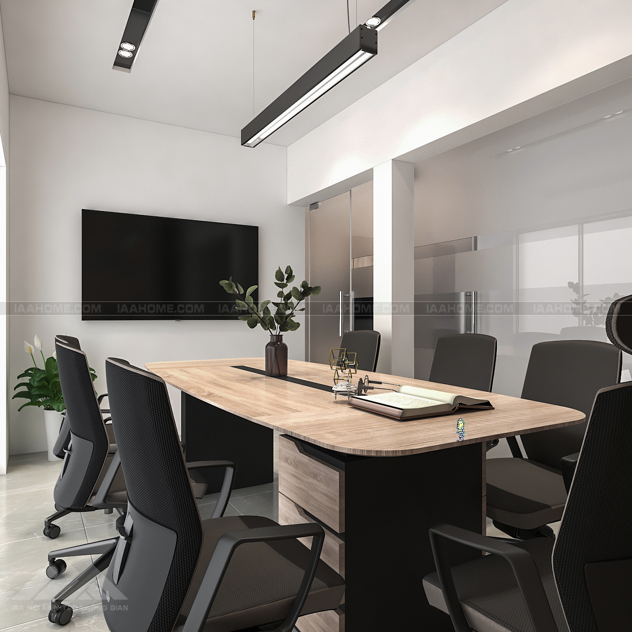 – Phòng họp với không gian cũng khá nhỏ nhưng IAA vẫn bố trí được với 7 chỗ ngồi . Thiết kế của phòng này với phong cách hiện đại chủ đạo điểm nhấn là hệ vách ốp gỗ hết mảng tường ,trên đó là logo tương hiệu của công ty rất ấn tượng .