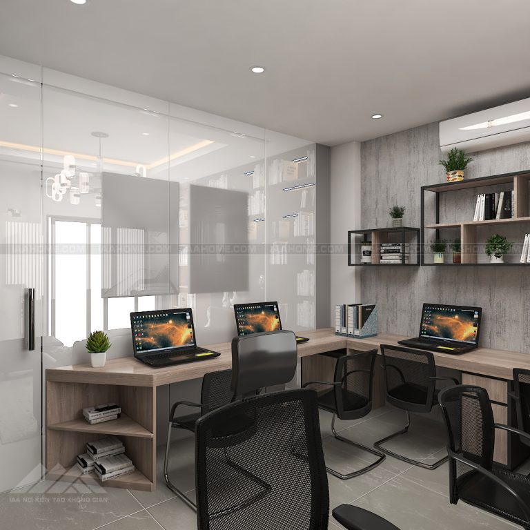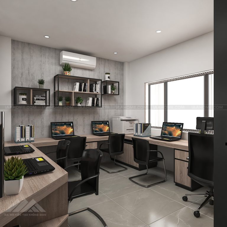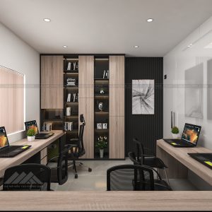 – Phòng làm việc với 7 nhận sự cũng được thiết kế với tông màu ghi đen kết hợp gỗ sáng với các chi tiết thiết kế trẻ trung ấn tượng , hệ tủ hồ sơ được cách điệu mới mẻ và hệ bàn làm việc cũng rất gọn gạng và hiện đại . Tổng hòa tạo lên 1 không gian làm việc tuy nhỏ nhưng rất cá tính và trẻ trung.