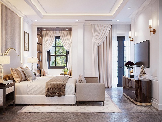 Phòng ngủ Master của biệt thự xa hoa và lộng lẫy với hệ thống rèm cửa, đèn và các chi tiết nội thất sang trọng.