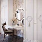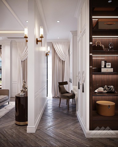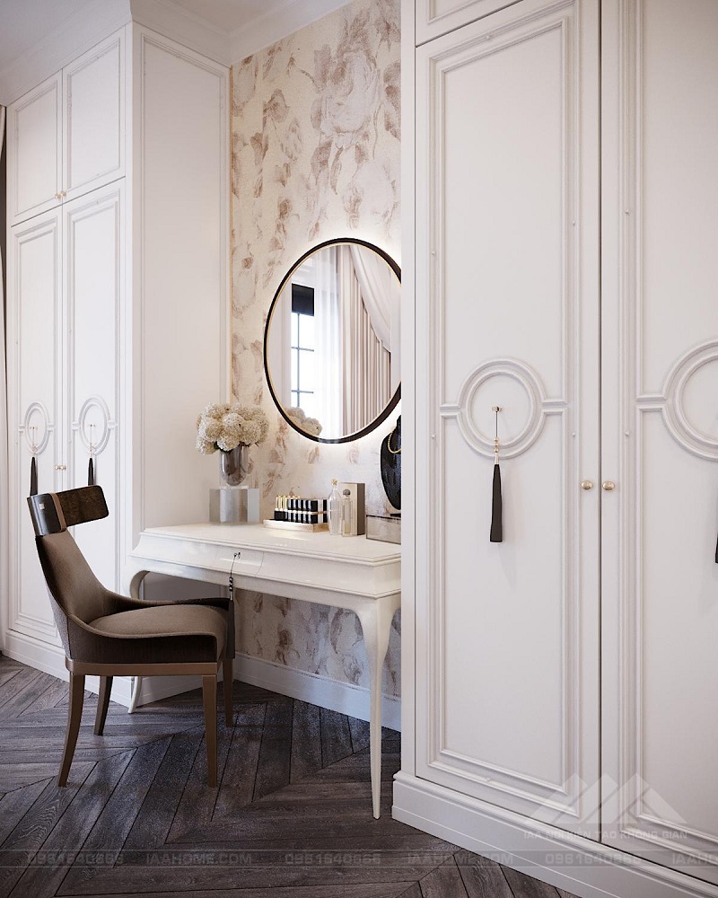 Khu vực trang điểm và tủ quần áo trong phòng ngủ rất rộng rãi. Nội thất chủ yếu sử dụng gam màu trắng kem. Sự bài trí này khiến không gian càng thêm rộng rãi và tinh tế hơn. Tone màu sáng khiến cho phòng cách tân cổ điển vừa đẹp xa hoa, vừa giữ được nét hiện đại một cách trọn vẹn nhất.