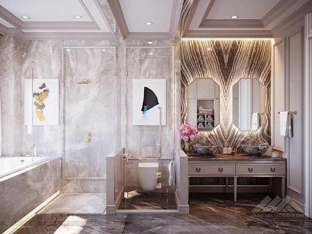 Không gian phòng tắm mang phong cách thượng lưu và đẳng cấp. Các chi tiết vân đá được tận dụng tối ưu làm điểm nhấn của không gian này. Hệ thống đèn, gương và kính tạo nên sự kết hợp đầy lỗng lẫy, ấn tượng.