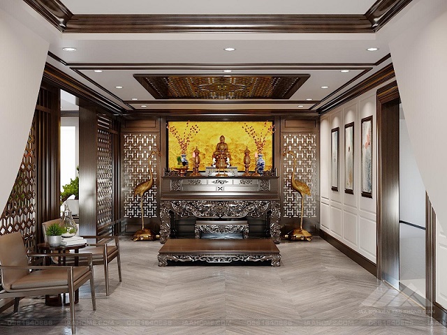 Phòng thờ được dành riêng một không gian riêng tư và rộng rãi. Với các vật dụng bằng gỗ được tính toán kết hợp mộ cách bài bản, chỉn chu. Phòng thờ hiện lên vô cùng trang trọng và linh thiêng.