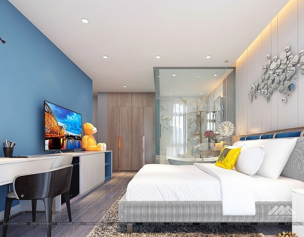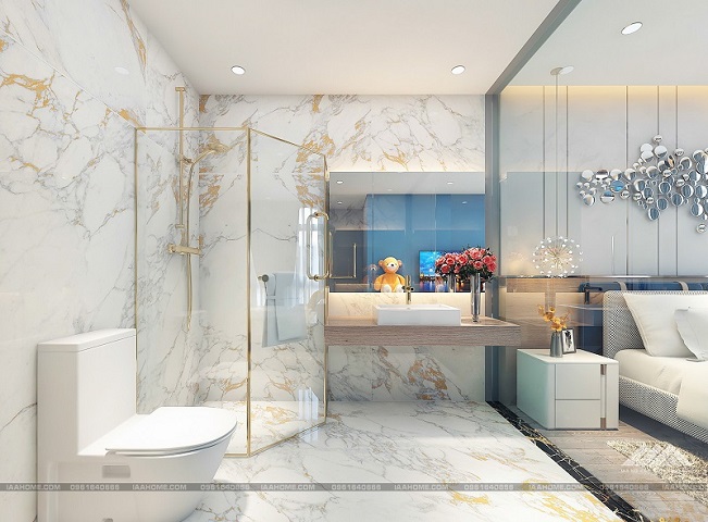 Ngoài ra việc cần IAA sáng tạo đến từ việc xử lý phần phòng vệ sinh cho các phòng ngủ. Với không gian rộng rãi các phòng ngủ này đều có vệ sinh riêng. Việc đưa vách kính vào phòng vệ sinh trong việc ngăn cách với không gian ngủ giúp các phòng thêm thông thoáng. Đồng thời thể hiện được sự cao cấp trong chi tiết hoàn thiện của từng sản phẩm của khu vệ sinh.