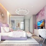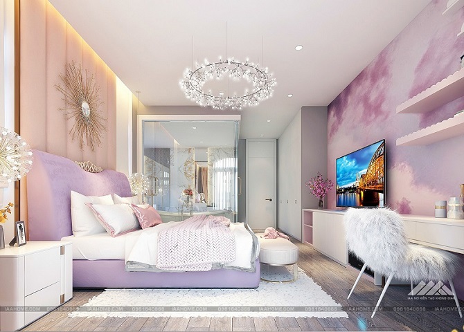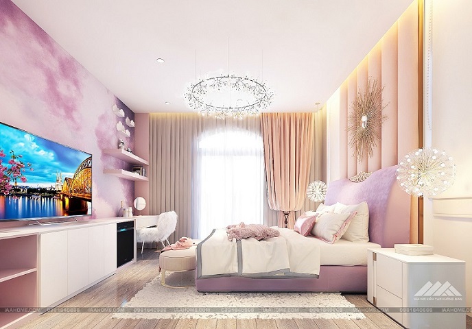 Phòng ngủ tiếp theo là một không gian vô cùng lãng mạn và thơ mộng với tone màu hồng phấn. Điểm nhấn nằm ở chi tiết đèn chùm pha lê, vừa độc đáo, vừa rất tinh tế và sang trọng.