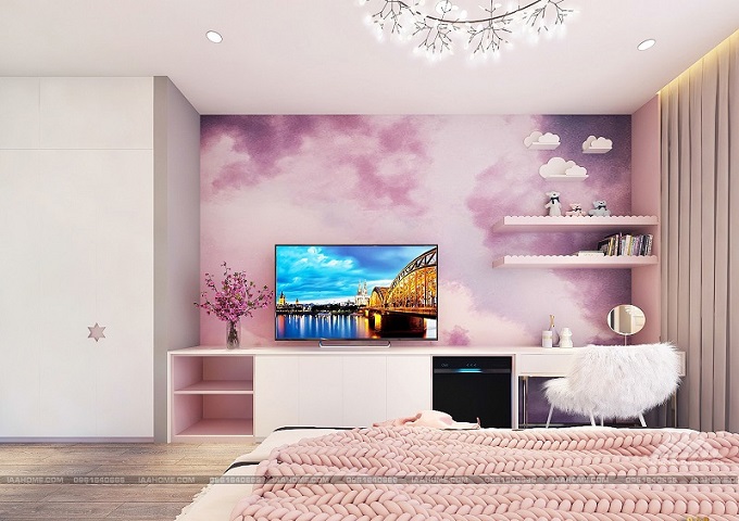 Khu vực tường chỗ để ti vi và bàn học được thiết kế vô cùng sáng tạo. Không gian đảm bảo sẽ khiến mọi bé gái vô cùng yêu thích. Kệ để ti vi tối giản cùng kệ sách  tạo nên sự kết hợp hài hòa và cùng ấn tượng.