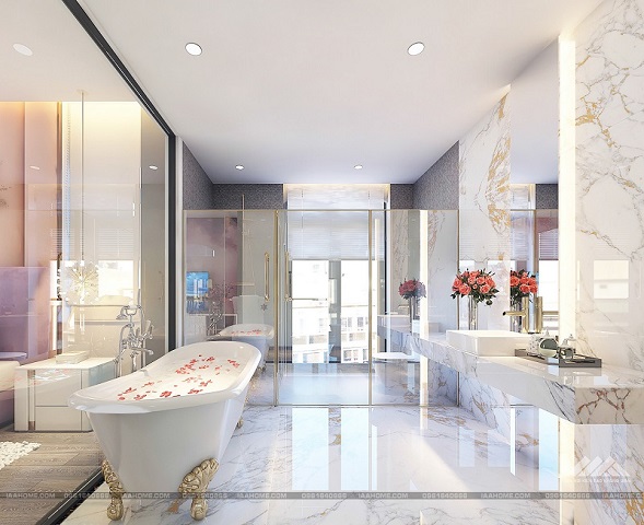 Phòng tắm tại biệt thự tân cổ điển được thiết kế nằm trong phòng ngủ Master. Ở đây IAA sử dụng đá  làm chất liệu chính, từ sàn nhà đến gạch lát tường. Những khối đá với từng đường vân mây đẹp mắt mang đến một không gian đầy sang trọng.