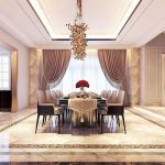 Đèn chùm là mẫu nội thất không thể thiếu trong phong cách tân cổ điển. Ánh sáng từ chiếc đèn phản chiếu xuống sàn gạch đá tôn lên những đường vân bóng bẩy. Cả căn phòng được “tắm” trong không gian đầy ấm áp, thanh lịch.