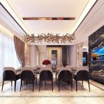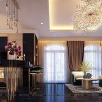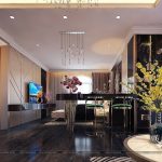 Phía trên là chiếc đèn chùm lấy ý tưởng vô cùng độc đáo và nghệ thuật. Những viên pha lê thay vì được thiết kế theo kiểu dáng cổ điển thì nó đã được biến tấu như những chiếc lá tài lộc. Kết hợp với khu vực tường lát đá (treo ti vi) và khu vực bếp nấu với tone trầm sang trọng. Tất cả tạo nên một diện mạo vô cùng hoàn hảo cho không gian lộng lẫy.