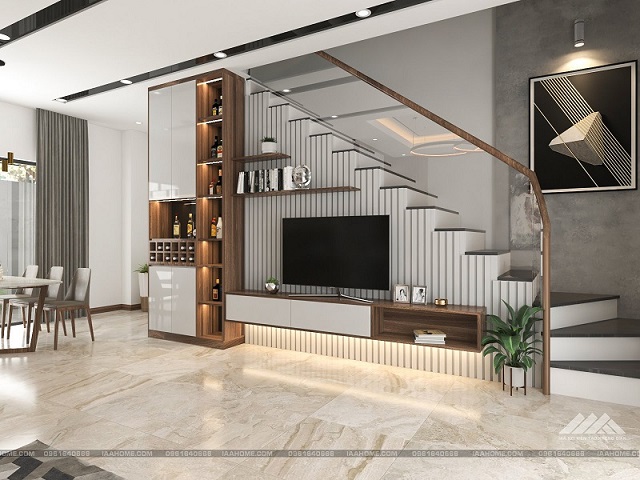 Ở phòng khách có sử dụng hệ tủ trang trí với chất liệu gỗ tự nhiên cao cấp. Hệ tủ này được dùng để đựng rượu kết hợp với hai giá nhỏ đụng sách và cây nhỏ tạo sự hài hòa, thẩm mỹ. Ánh sáng sử dụng là tone màu ấm khiến không gian trở nên nhẹ nhàng và ấm cúng hơn.