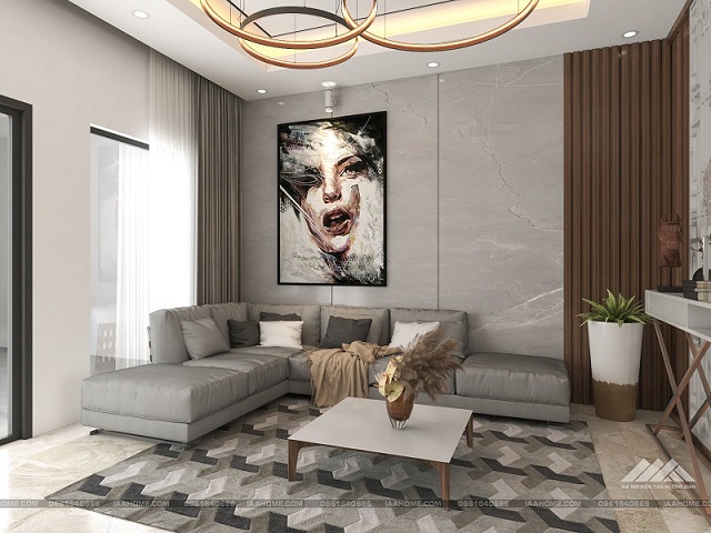 Là nơi sinh hoạt chung và tiếp đón khách, phòng khách được thiết kế để tạo thêm cảm giác rộng rãi. Các điểm nhấn nhẹ nhàng, đơn giản nhưng vẫn mang đầy đủ tiêu chuẩn cần có. Giữa không gian là bộ sofa góc L mang màu sắc xám nhạt rất thanh lịch. Điểm đặc biệt khi dụng mẫu sofa này đó chính là tiết kiệm được không gian. Mà vẫn không ảnh hưởng đến thẩm mỹ của phòng khách.