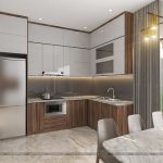 Phòng bếp sử dụng gam màu nâu sáng tương phản để tạo nên sự liên kết với không gian phòng khách. Hệ tủ được sử dụng tối ưu nhằm tiết kiệm diện tích. Hệ thống đèn cũng được tính toán kết hợp để giúp không gian trở nên hoàn hảo nhất.
